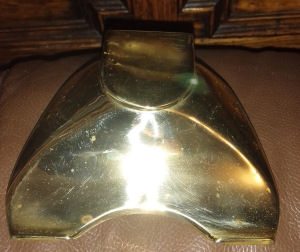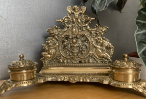Vintage/antique heavy brass inkstand. Lid on inkwell has had its hinge repaired. One of the ceranmic liners has a crack. Brass has been polished. Lovely item £45.00 plus p&p but would prefer collection in person due to weight.