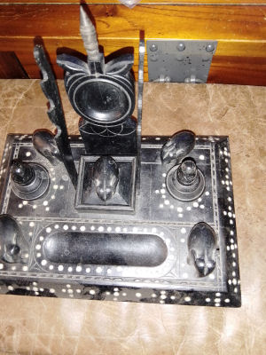 Ebonised Elephant Inkstand/Letter Rack with Dip Pen made from recycled oak, antique/vintage real ebony wood ink pot with bakelite liner, bovine carved elephant. £40.00 plus p&p