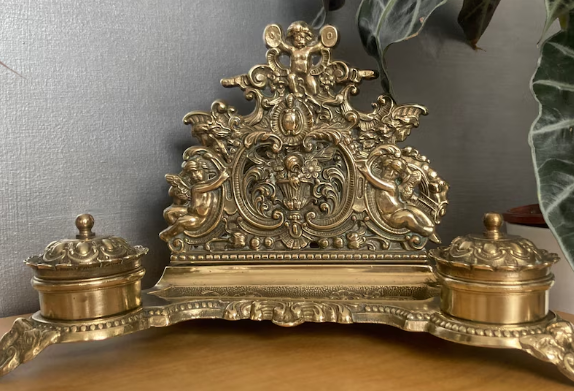 Art deco brass inkwell with a standing Dutch boy figure and brass lidded glass ink bottle. Measures 3in x 8in. Set into a handmade shaped oak plinth made from recycled wood teamed with a modern brass and wood dip pen. £45.00 plus p&p.