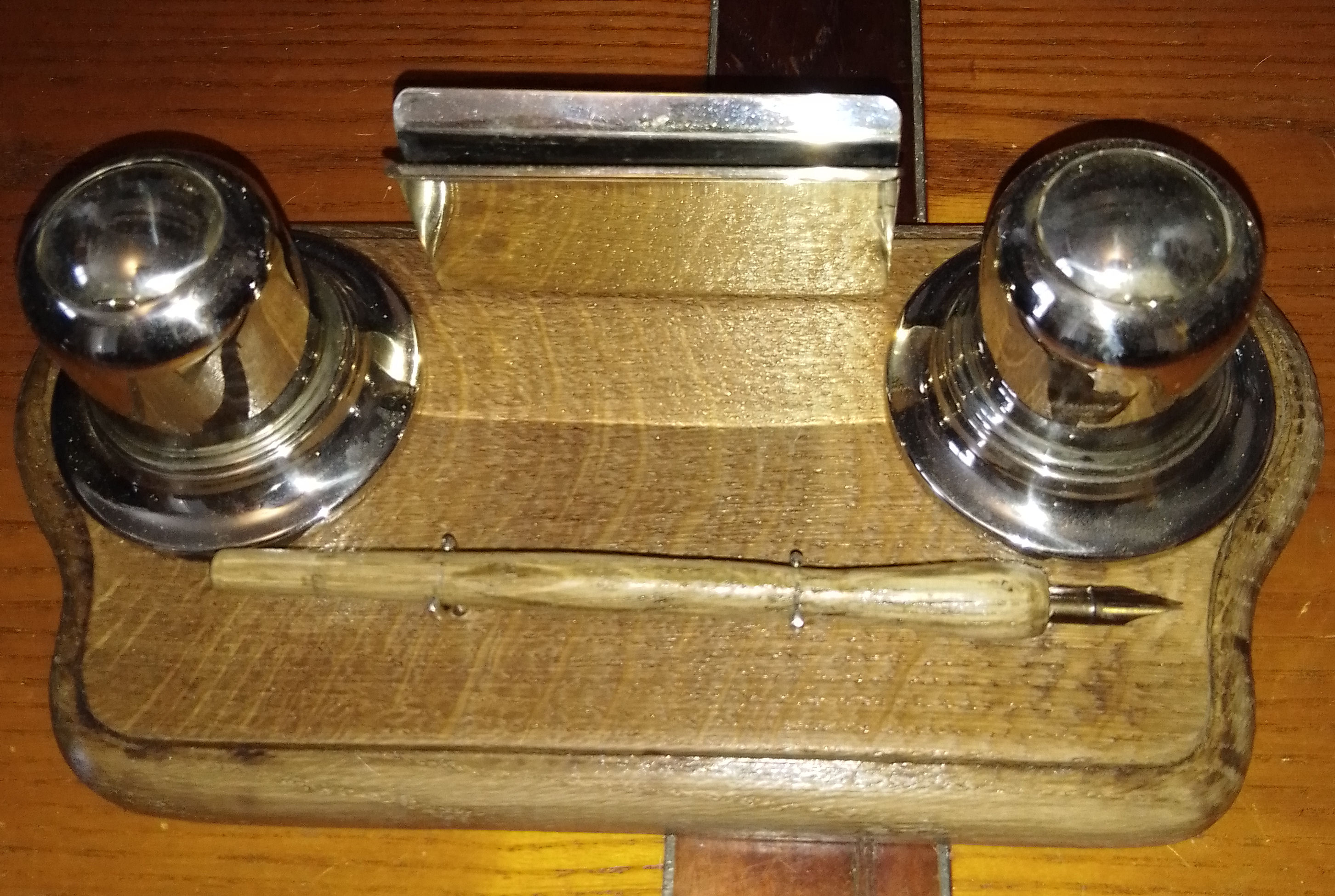 Penny Topped Inkstand. Handcrafted oak base with two antique/vintage glass ink bottles with manufacturers details. Slight crack in one bottle but no leaks, Handmade copper lids with inset Victorian pennies. Handmade wooden shaft dip pen. One of a kind. £28.00 plus p&p. |